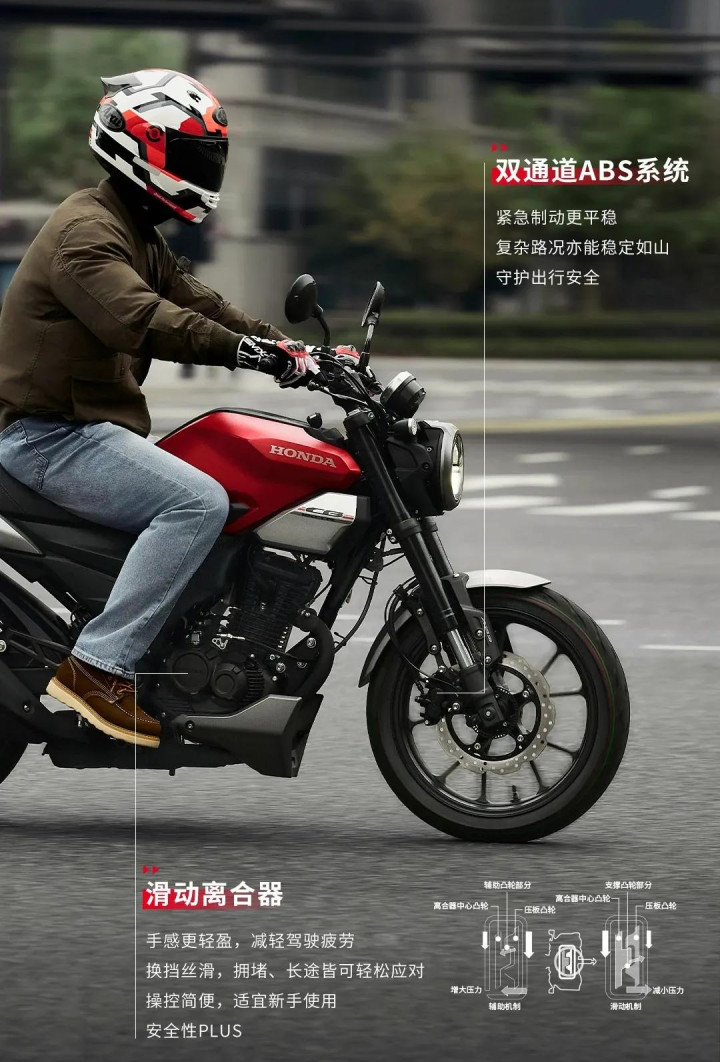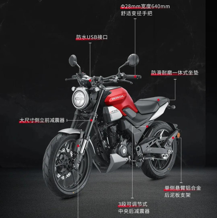 之前CBF190TR的单前ABS被不少摩友吐槽,新大洲本田也算听劝,这次在新款CB190TR上终于配备了前后双通道ABS,安全性有了进一步的提升。其他配置方面,像液晶仪表、USB充电口、LED前后灯组、3段可调后减震也得到了延续。其它参数方面,2025款CB190TR座高791mm,比老款增高了4mm;整备质量142kg没变,油箱容积从10.5L增大到了12L,最高车速从111km/h降到了107km/h,前轮规格110/70-R17,后轮规格140/70-R17。